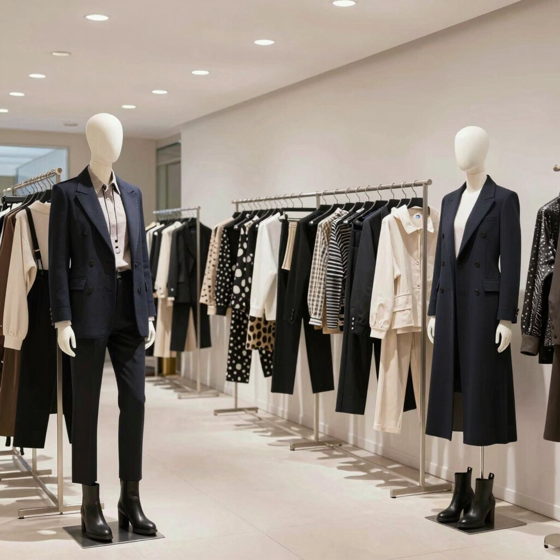 Elegant display of readymade garments arranged neatly in a modern Dubai showroom.